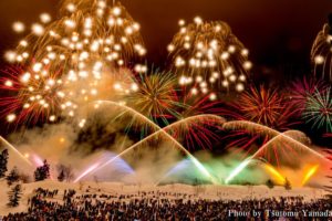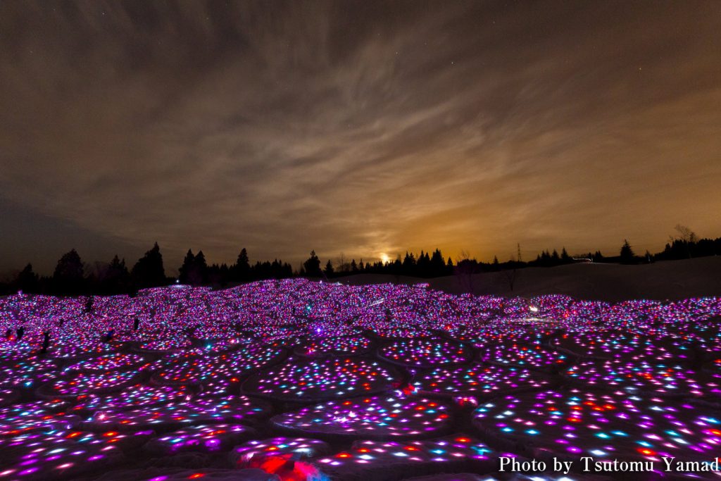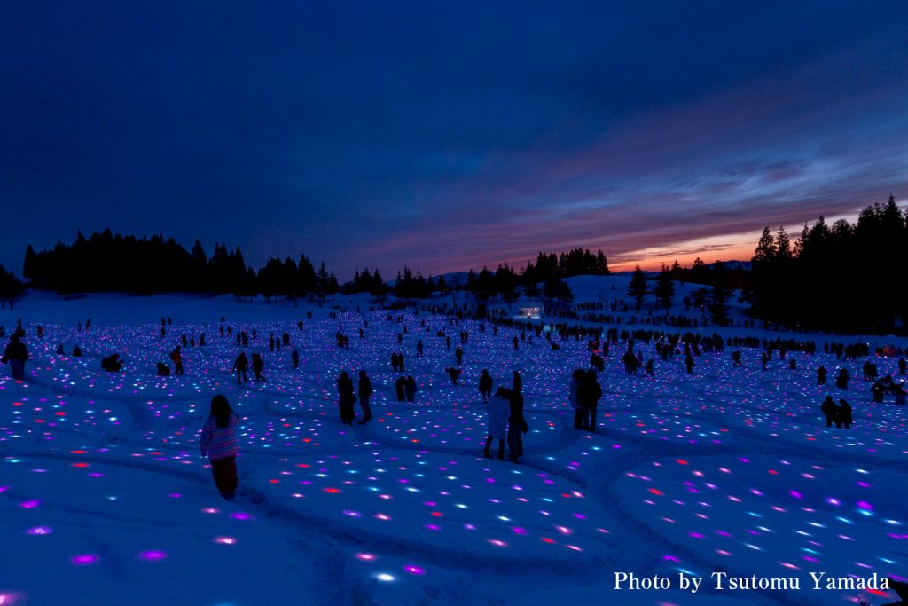 「越後妻有 雪花火」は、越後妻有の雪原を舞台に花火を打ち上げ、闇のなかに真っ白な雪の世界を一瞬浮かび上がらせます。