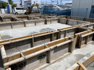 土台となる部分ができると基礎の立ち上がり部分も同様に型枠を組み、コンクリートで形成していきます。