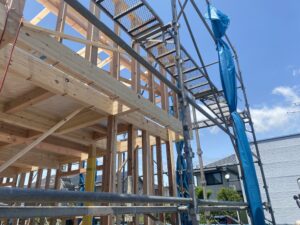 先月上棟もあり大工さんが総出で柱を建てたり梁を組んでいったりして無事上棟も終わりました。
