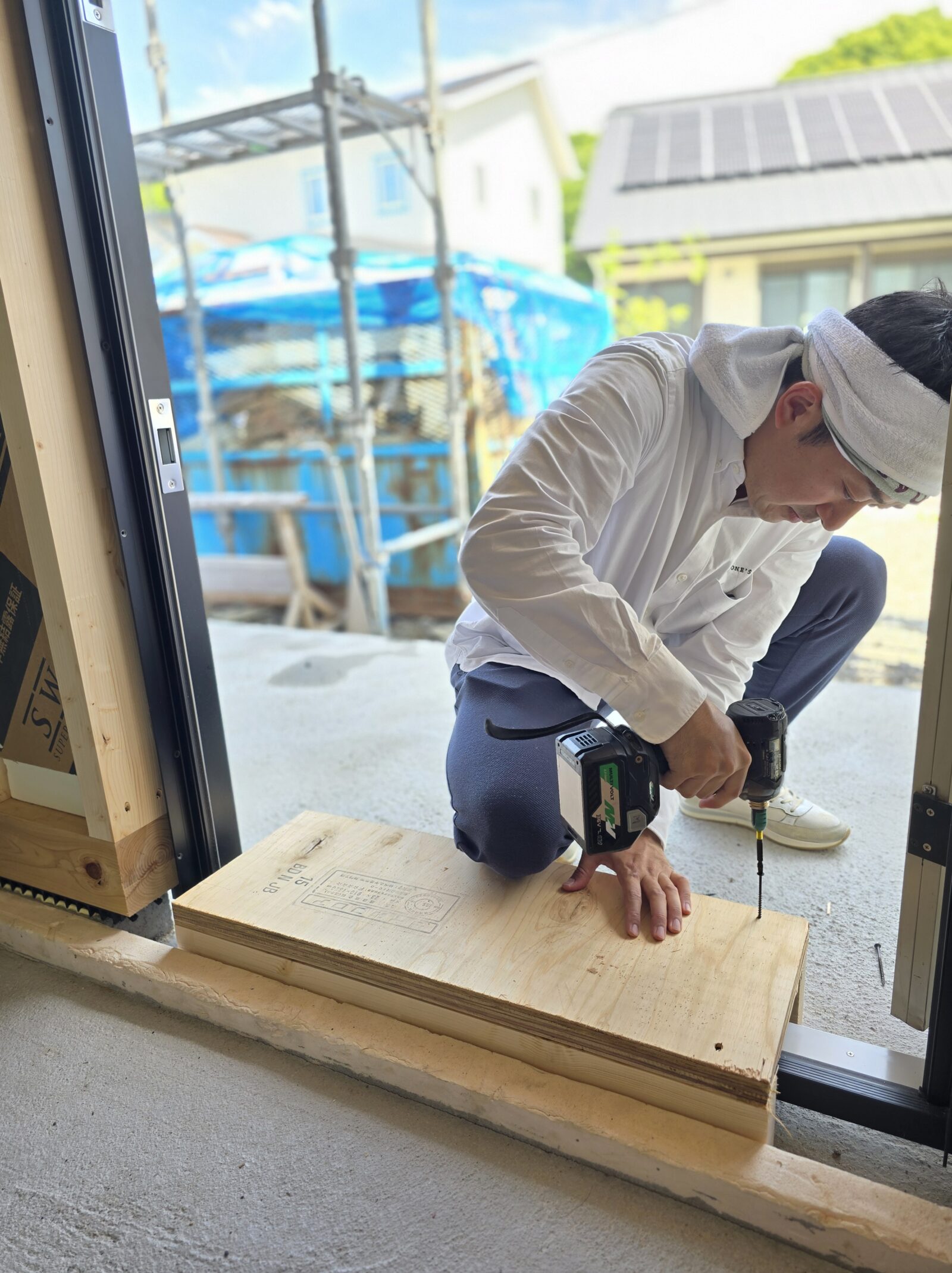 ↓見学会初日は、三谷大工がお客様が通りやすいように玄関ドアの下枠保護のための箱を作製していました!