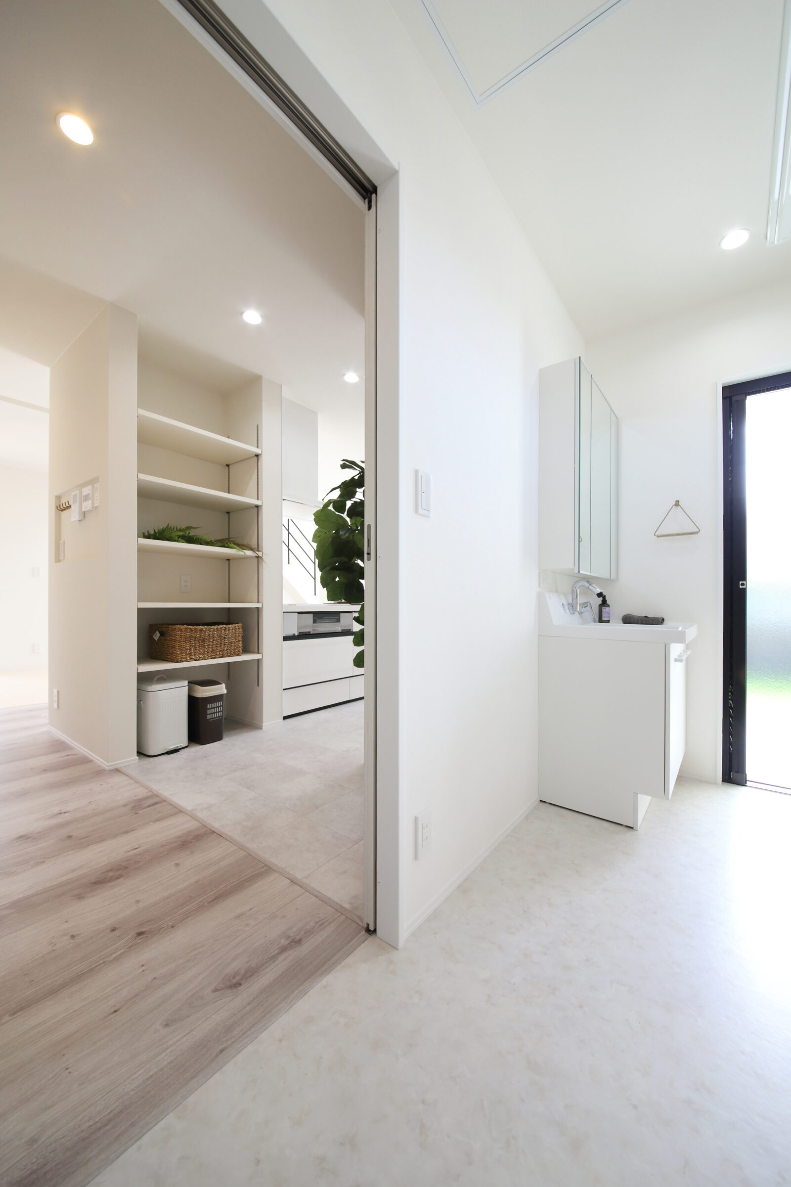 たとえば、洗面室・キッチン・玄関廊下で行き来できるように回遊性を持たせるとします。