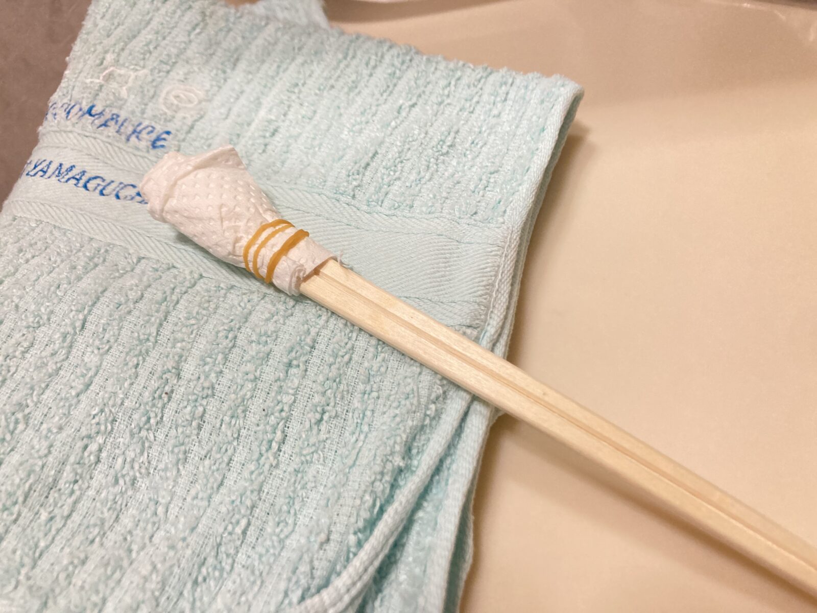 割り箸の先にペーパーを覆うように巻き付け、輪ゴムで根本を止めると、掃除割り箸の完成です。