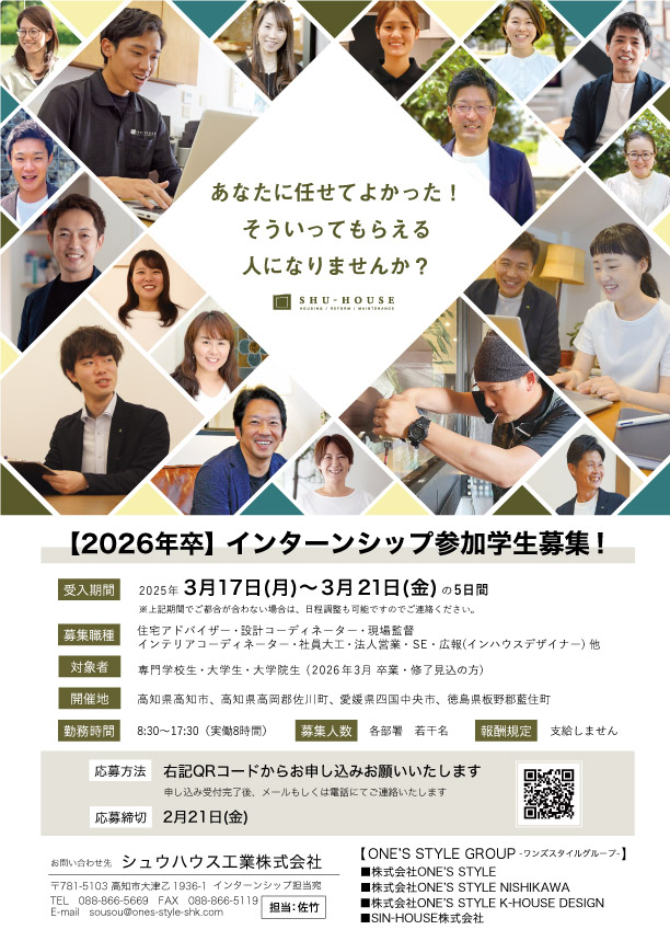 シュウハウスでは、3/17(月)~3/21(金)の5日間をインターンシップ開催で予定しています。