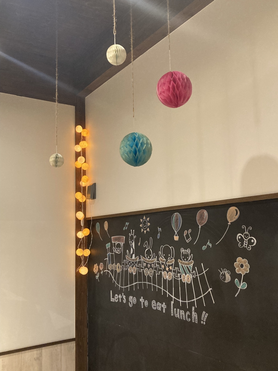 昨日、カフェでお客様が帰られた後、備品を補充しているときにパッと上を見上げると可愛い飾りが吊下げられていました。