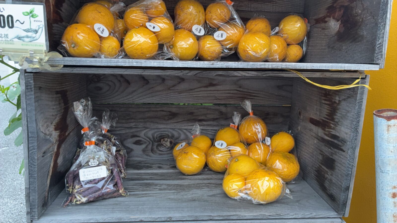 「良心市」は道端で見掛ける無人の販売所のことです。 販売所というものの、簡単な屋根の付いた棚などに野菜や果物などを中心とした商品を並べた簡易的なお店です。 気に入ったものがあれば料金箱などにお金を入れて、欲しい商品を買っていくというシステムになっています。