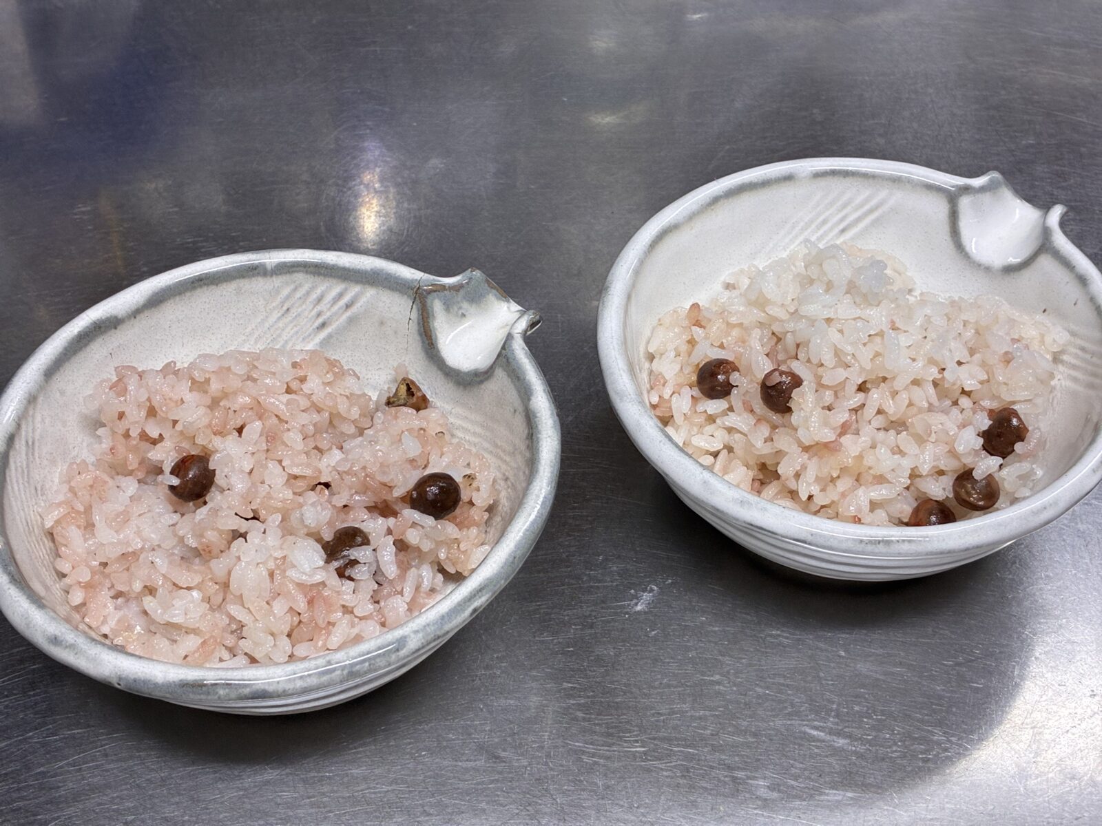 左側が祖母がくれたエンドウご飯です!私が炊いた右側と比べるとほんのりですが赤くなっていますね🍚