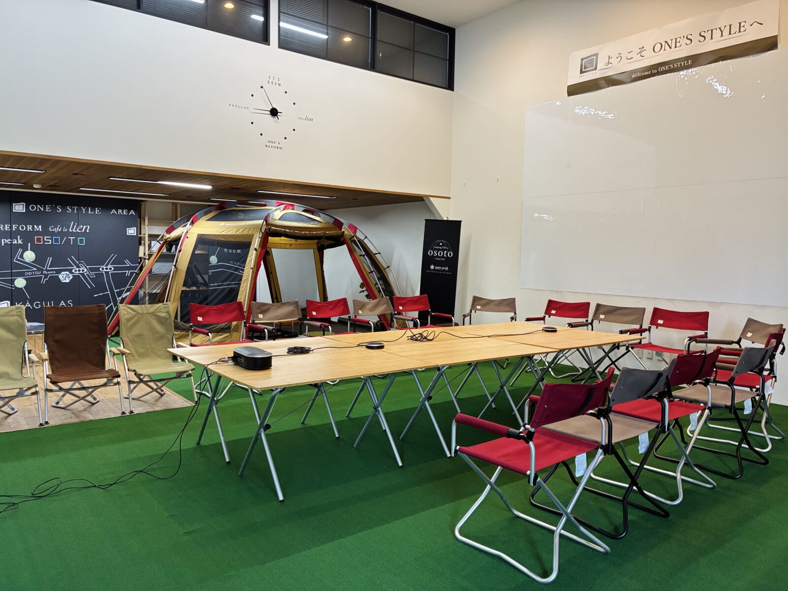 朝礼時はこのようにテーブルをスタッフの人数分のイスでぐるっと囲み、集まって行っております。