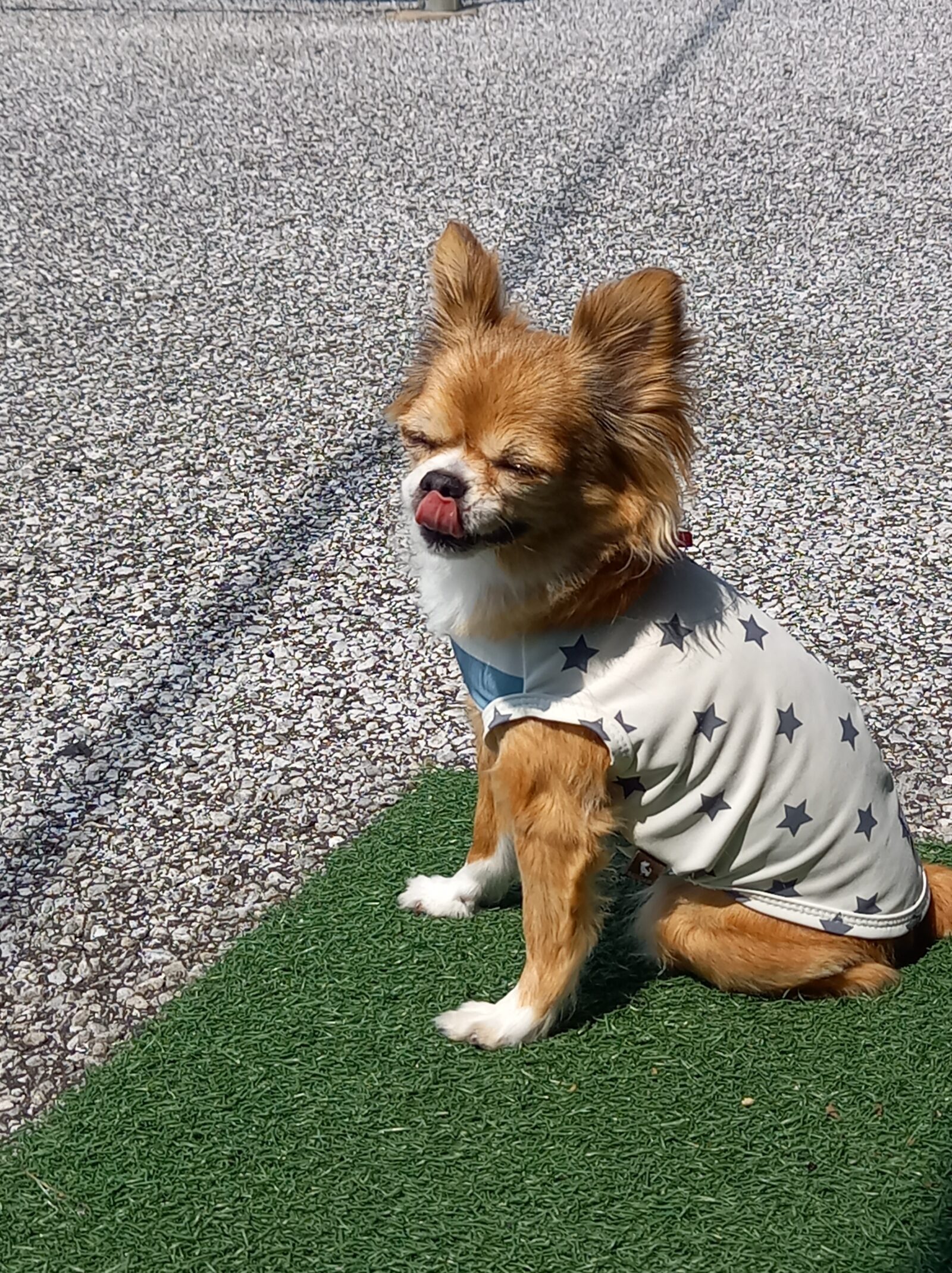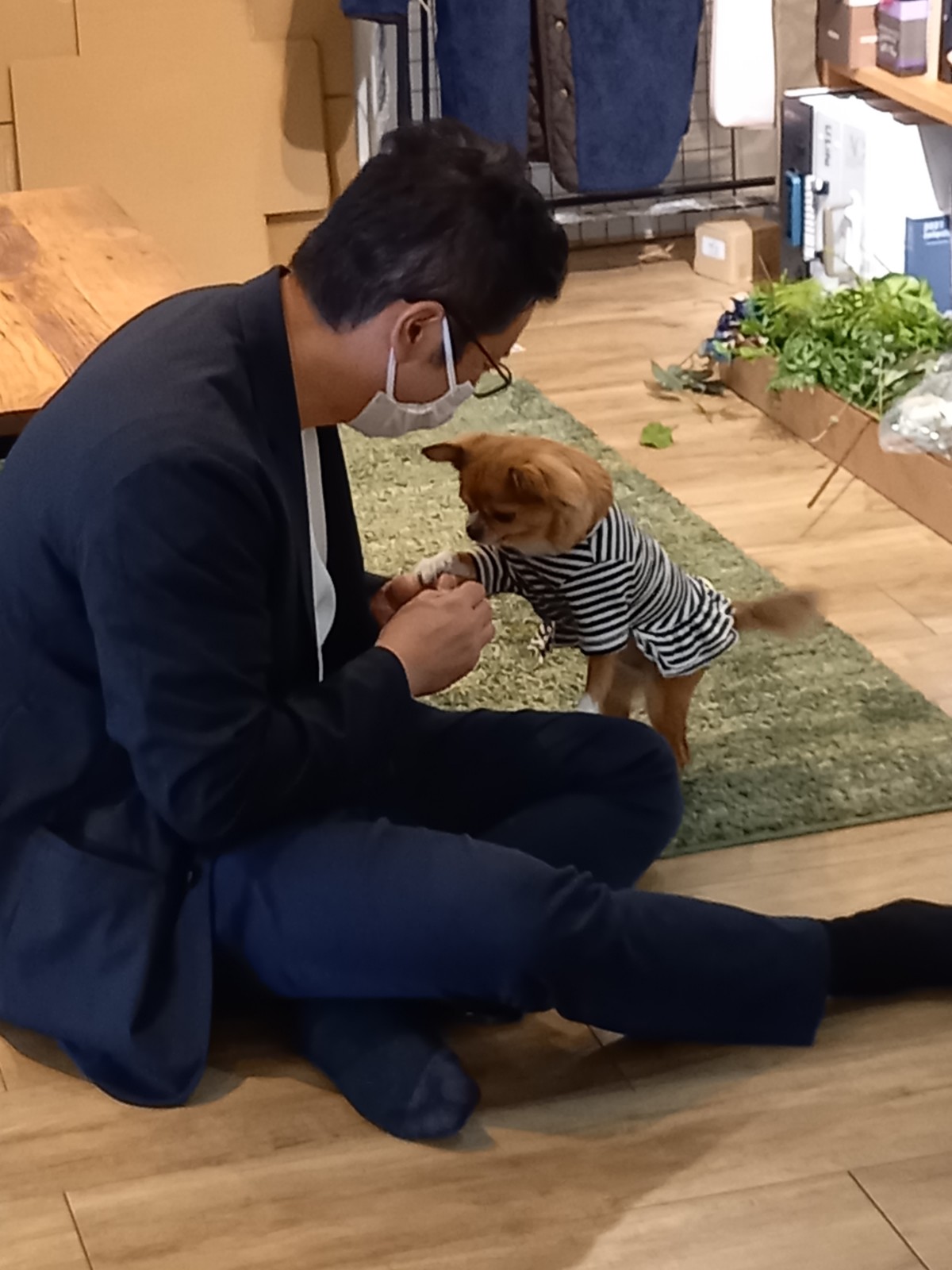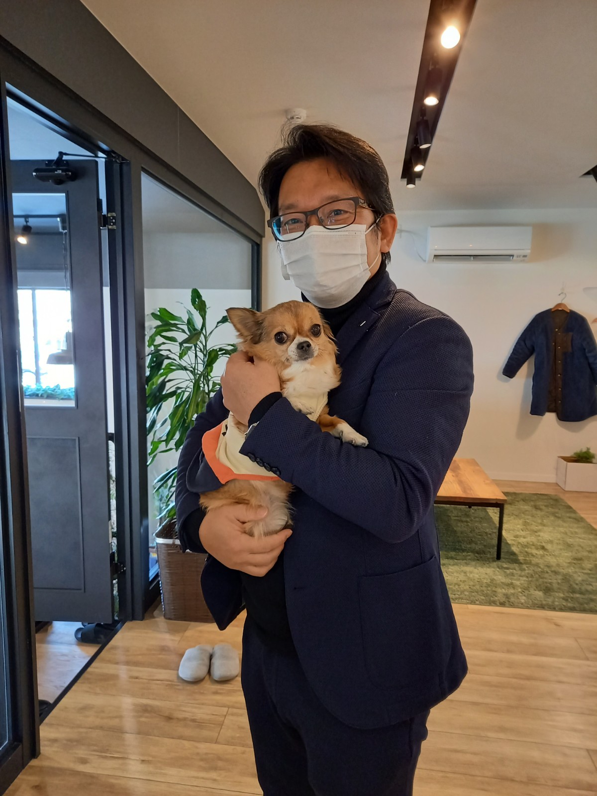 社長に抱かれたクッキー、ちょっと緊張気味?💦