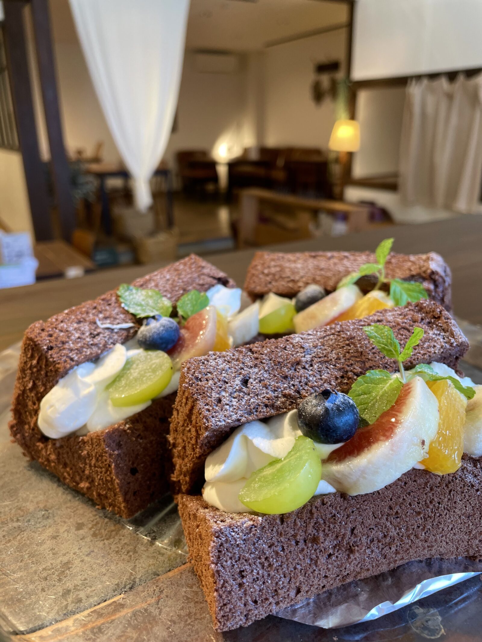 プリンの上にある事も多く華やかで、プリンとシフォンケーキの2つの楽しみがありますが、シフォンケーキの時は季節のフルーツがいっぱいサンドされていてより一層華やかです