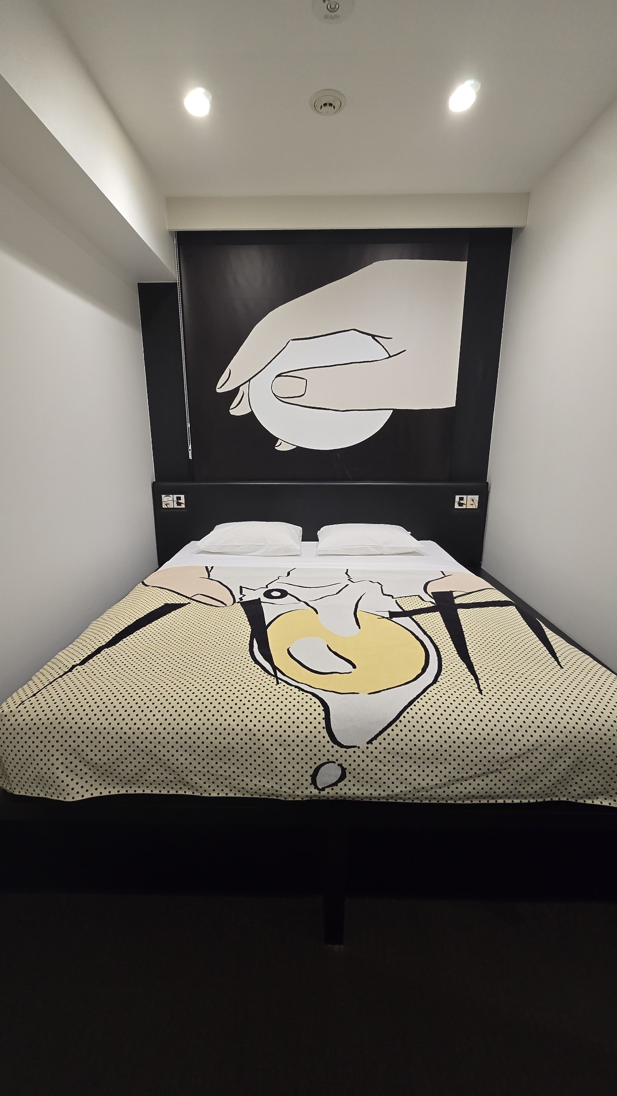 お部屋もなかなかのインパクトで、ベッドカバーとロールスクリーンに卵のイラストが。