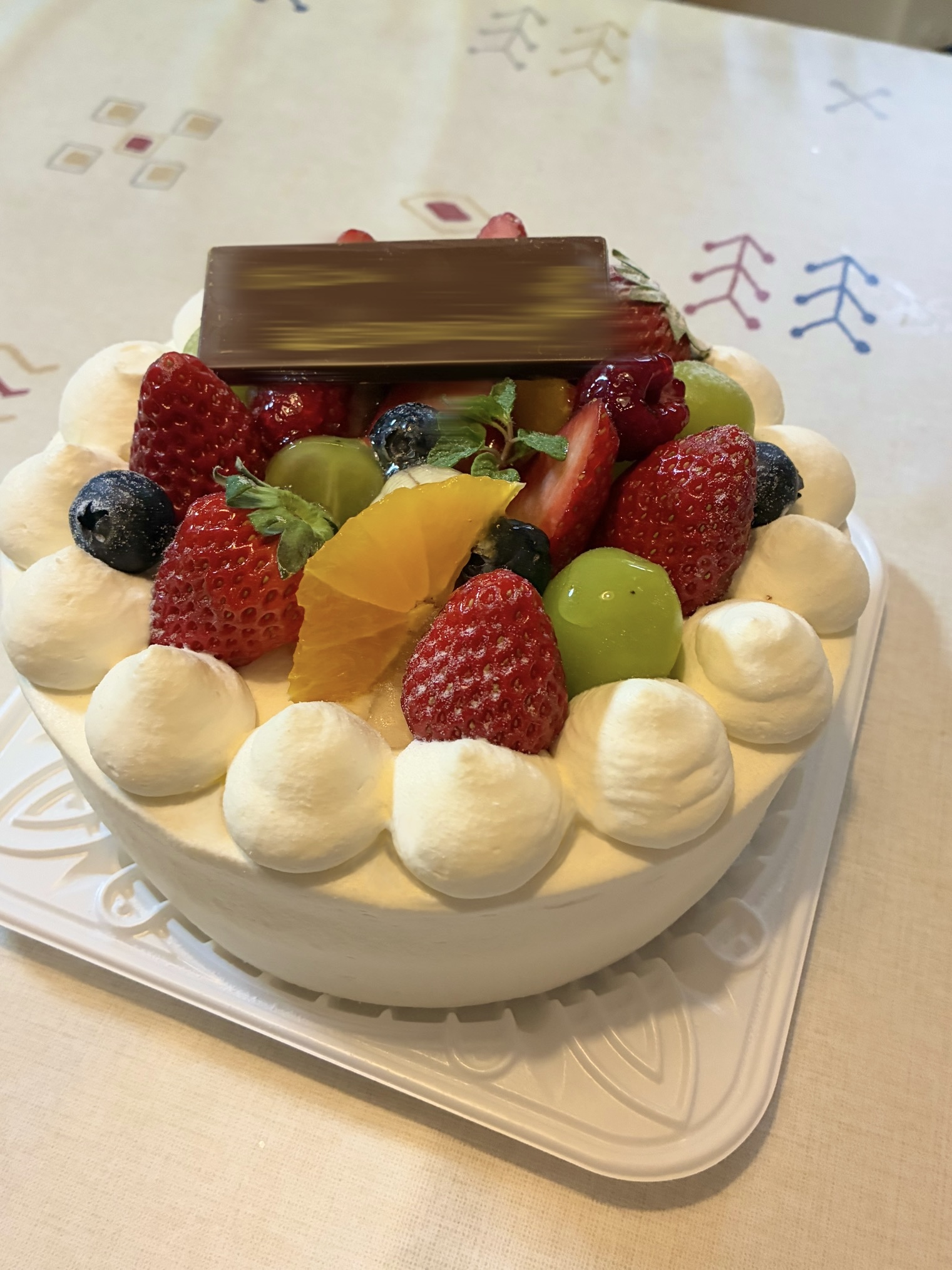 前回購入したお店のショートケーキは、2層のスポンジに上部はフルーツが円のように並んだものだったので、リアンのホールケーキも同じような形と勝手に思っていたため、嬉しい誤算でした。