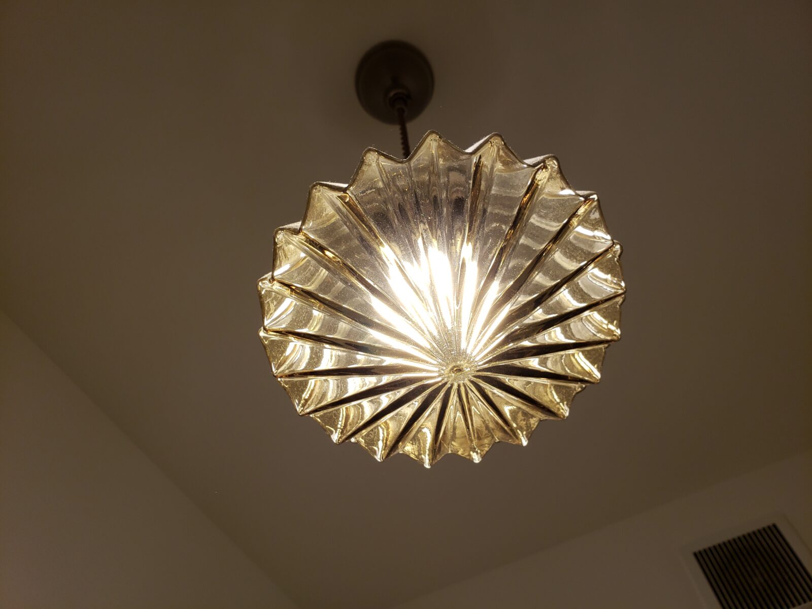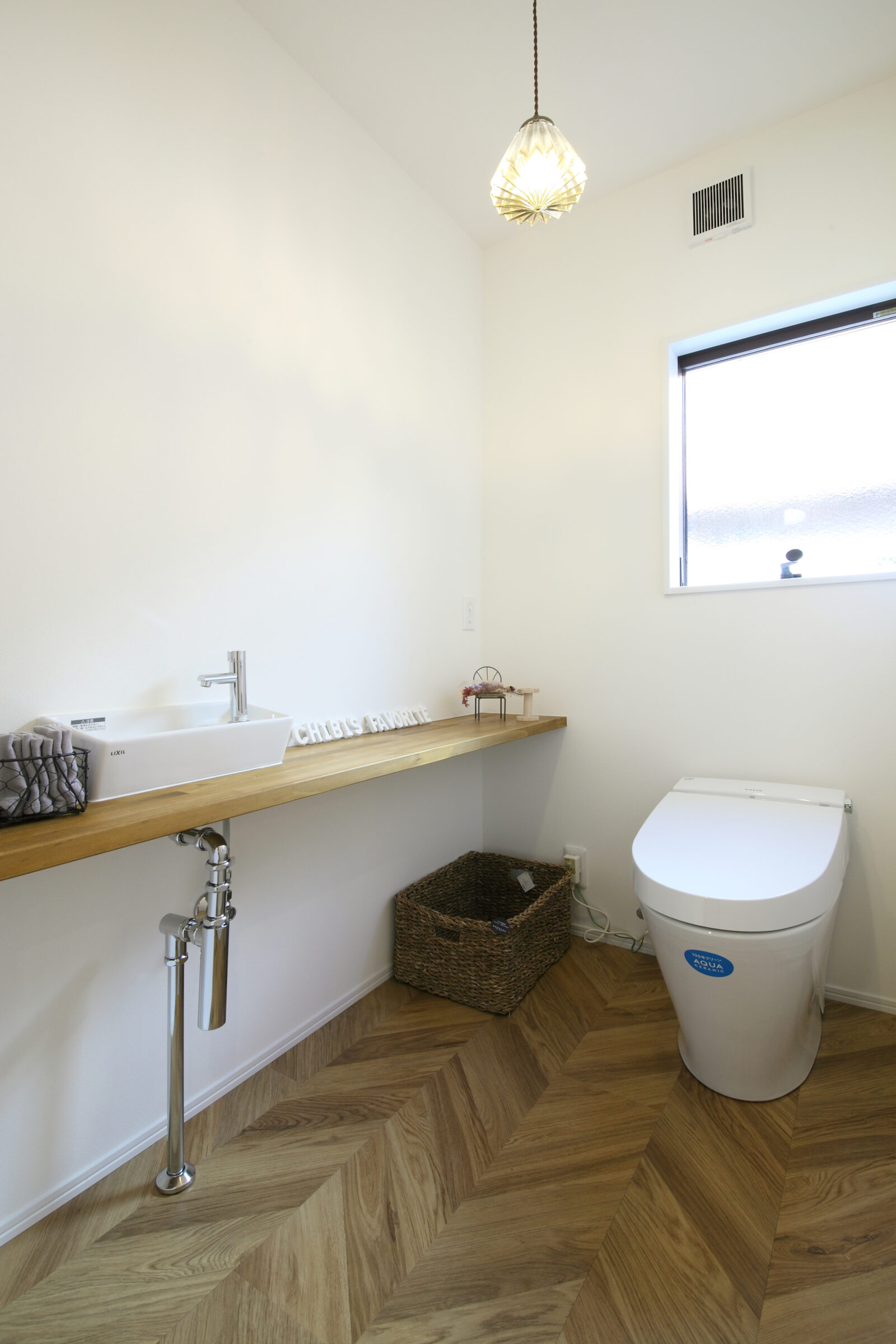 そしてこちらは我が家のトイレのペンダントライト。弊社のインテリア事業部カグラスで取り扱いしている、レトロなデザインのペンダントライトです。こちらは新築のお客様でもよくご採用いただいております♪