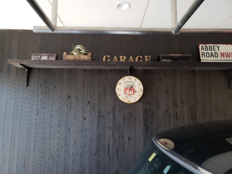 我が家のガレージの壁面にはアンティーク風の看板と時計を飾っています。錆びているように見えますが、そういうデザインで色付けされています(*^-^*)