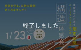 1月23日(日)構造見学会を大津乙にて開催いたします! ぜひご家族そろってご来場お待ちしております! 構造見学会について 建設途中のお家を1日限定公開いたします。できてからは絶対見ることができない柱や梁の構造、そしてシュ … 続きを読む 【終了】1日限定 高知市大津乙構造見学会開催!《予約制》 1/23(日)