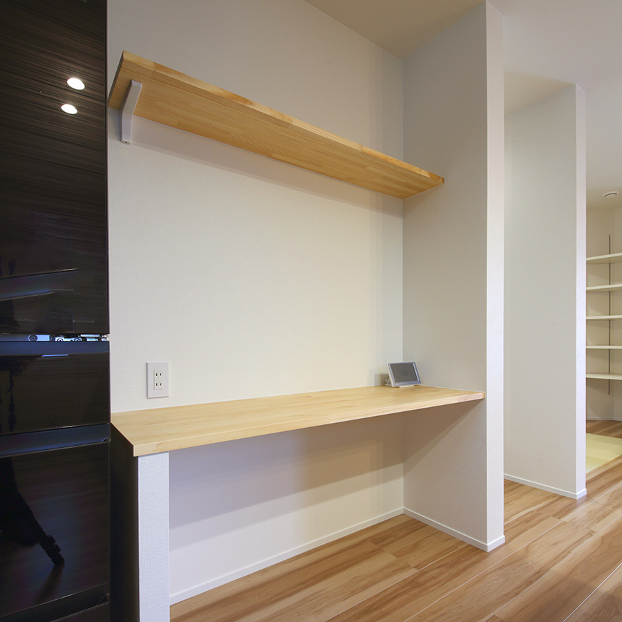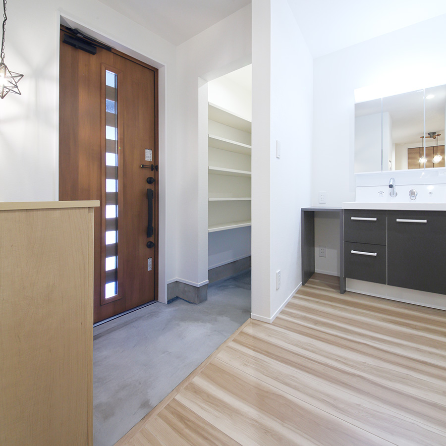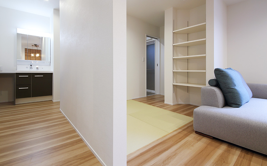 26.5坪とコンパクトながらもそれを活かした、凹凸のないシンプルな間取りに。水回りやウォークインクローゼットを隣接させ、家事を楽に行える動線になっています。ご主人様のお仕事場は集中できる空間になるよう廊下に設けました。
