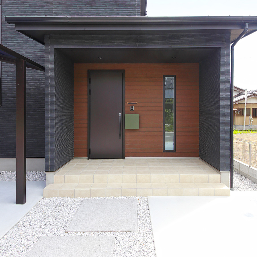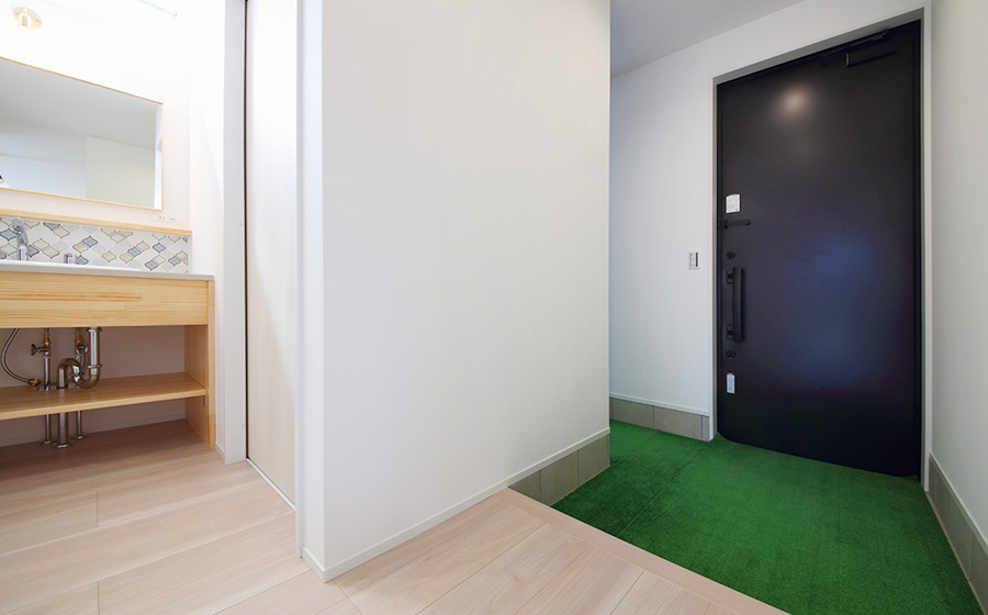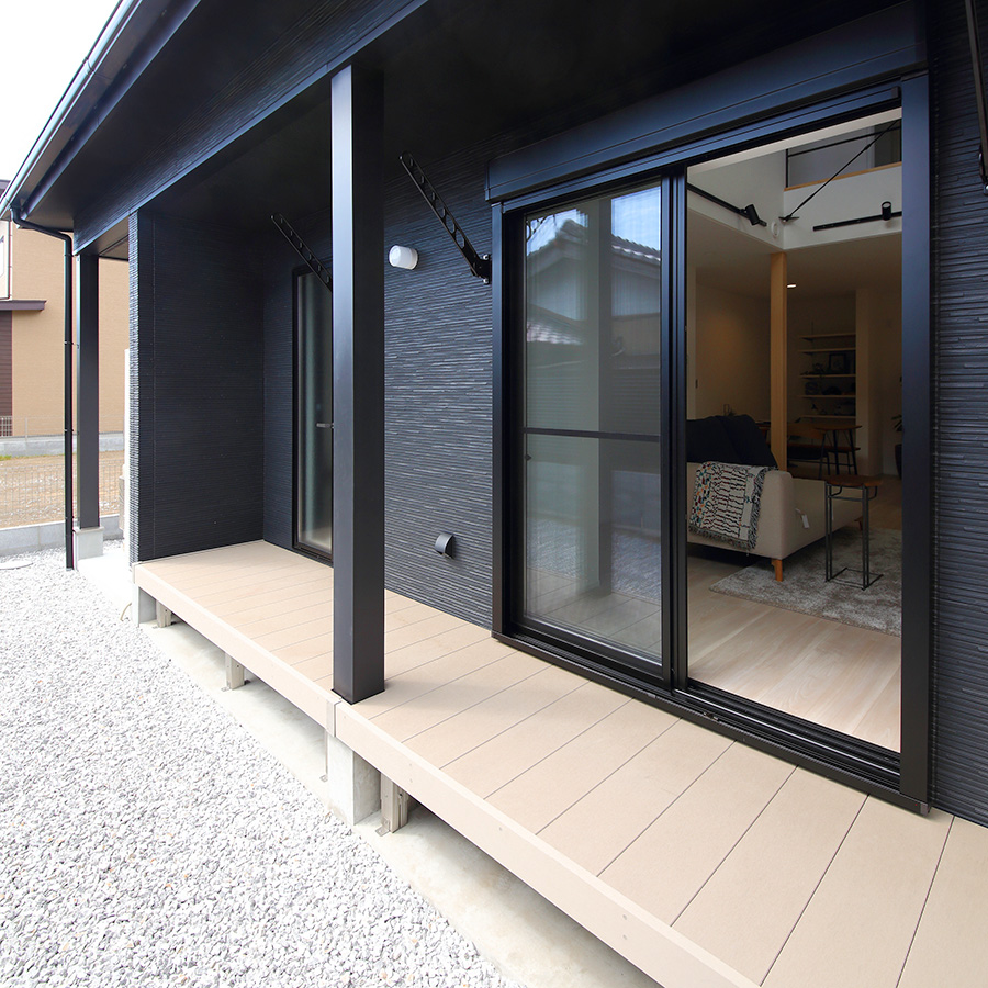 帰宅後すぐに着替えたり、外へ干した洗濯物をすぐクローゼットに取り込められるようにと、玄関、ウォークインクローゼット、ウッドデッキが一直線になった間取りになっております。