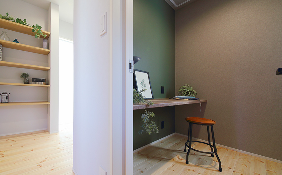 また、ご主人様が集中して仕事ができる書斎や趣味であるロードバイクが掛けられる玄関など、ご家族一人一人の生活スタイルに寄り添った間取りとなっています。
