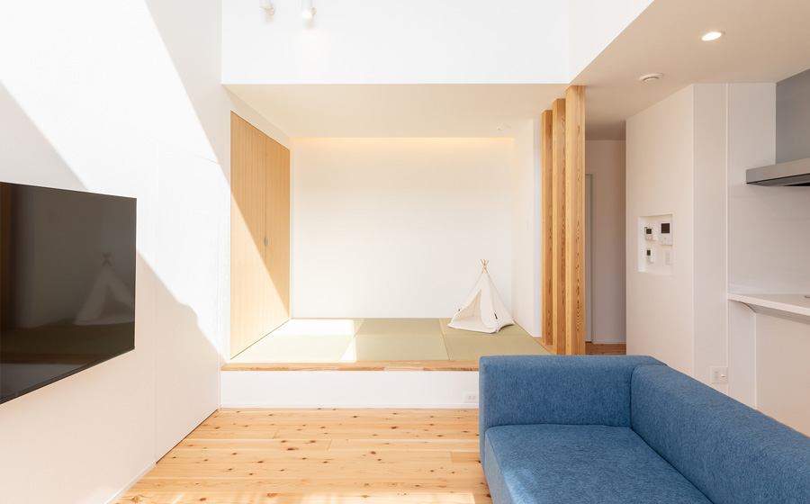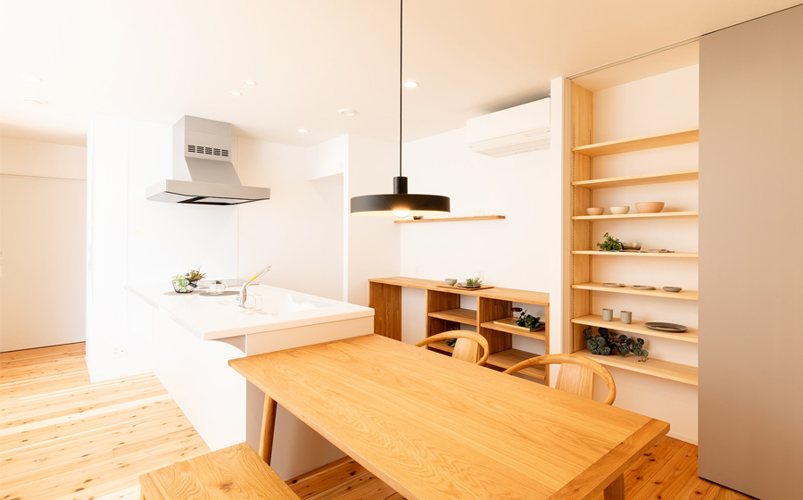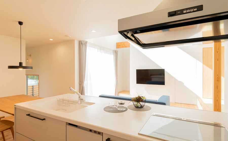 ご夫婦のこだわりでもあるフルフラットキッチンはスッキリスタイリッシュに、開放的なLDKと和室のつながりともあわさって素敵な空間になりました。ネットカフェのような雰囲気のワクワクする趣味部屋がある素敵なお家です。